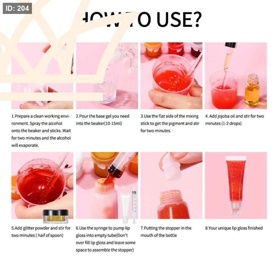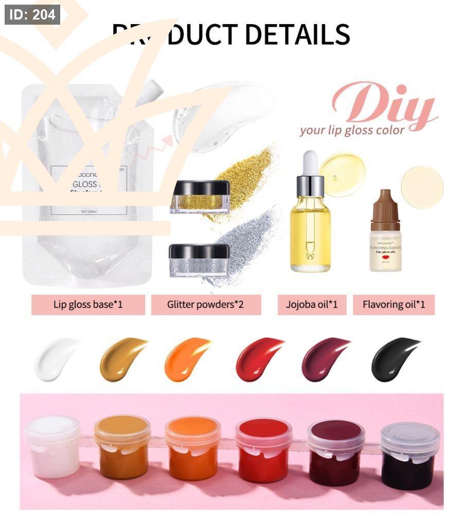 تفتحين البكج وتلقين كل المكونات مرتبة: زيوت طبيعية مغذية، قاعدة شفافة لامعة، ألوان جذابة، وروائح حلوة تضيف لمسة خاصة. تبدأي بالخطوات وكأنك في مختبر صغير للجمال 👩🏻🔬— تخلطي الزيت مع القاعدة، تضيفي اللون اللي تحبينه، وبعدها تختاري إذا تبغين لمعة جليتر أو لمسة شفافة ناعمة.